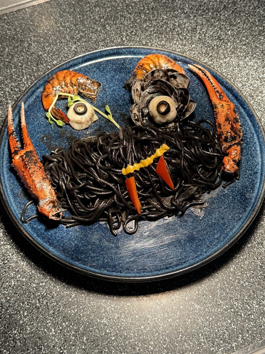 ▲「怪怪墨魚麵」則以漆黑如夜的墨魚麵搭配濃郁海味醬汁,帶出深海的暗黑魅力,為味蕾帶來奇幻新體驗,有趣的造型更是應景又好拍。(圖/將捷金鬱金香酒店提供)