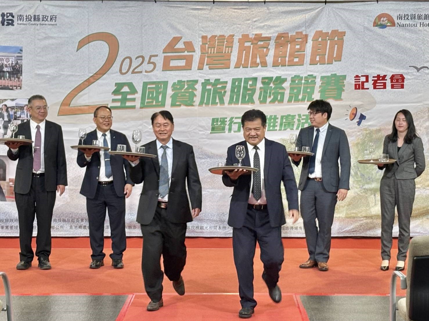 「2025台灣旅館節全國餐旅服務競賽」將於12月4日(週四)在日月潭瑞居渡假飯店盛大登場!南投縣旅館商業同業公會於今(26)日在南投縣政府一樓大廳舉辦賽前記者會,由交通部觀光署日月潭國家風景區管理處副處長湯維堯、南投縣政府簡青松代理秘書長,以及旅館公會理事長暨日月潭觀光圈聯盟盟主李吉田共同主持,現場冠蓋雲集,觀光處處長陳志賢、科長黃山、立委馬文君辦公室秘書黃炫瑞、立委麥玉珍辦公室主任林季園、林儒暘議員服務處秘書許志輝、宋懷琳議員服務處秘書廖國清、中華民國溫泉觀光協會總會長李浩瑋、南投縣旅館公會榮譽理事長林志穎、南投縣信義鄉東埔溫泉觀光協會理事長張進忠、南投縣水里鄉商圈創生發展協會理事長徐玉玲、南投縣清境觀光協會理事長張宏毅、孟宗山莊大飯店總經理林漢崇、達谷蘭溫泉渡假村董事長張進忠、日月潭鴻賓大飯店副總經理黃佳莉、日月潭瑞居渡假飯店執行長蔡佳佁、雅薇精品休閒旅館執行長黃仁羣、箱根生活館董事長林原毅、丞萬尊爵渡假酒店副總經理莊秉璁、西站行旅董事長特助蔡佳晏、帝綸溫泉渡假飯店副總經理黃綉蓮、東光大飯店董事長謝福來、杉林溪森林生態渡假園區經理楊翊偉、樹德半山夢工廠副主任朱紀穎、團務劉宗哲,及南開科技大學休閒事業管理系教授曾干育等產、官、學界貴賓共襄盛舉,為全國最具指標性的餐旅技能盛會揭開序幕。