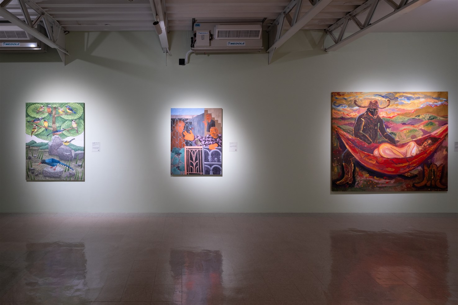 「記憶迴旋」展區則呈現記憶的多重面向與深刻厚度。Katja Farin (b.1996) 於南方澳駐村經驗創作,其畫面中人物的受限姿態與象徵自由的意象呈現內在情緒張力;Howard Fonda (b.1974) 以動物取代人類,將記憶、文化與個人經驗化為象徵符號,引導觀者反思自身與社會的關係。Joseph Olisaemeka Wilson (b.1999) 用色彩與筆觸再現記憶中的情緒與混亂;Katarína Janečková Walshe (b.1988) 則融合個人經歷與文化記憶,探問性別、身份與社會關係。這些作品邀請觀者在畫面中回望自我,感受情感與記憶的交錯共鳴。