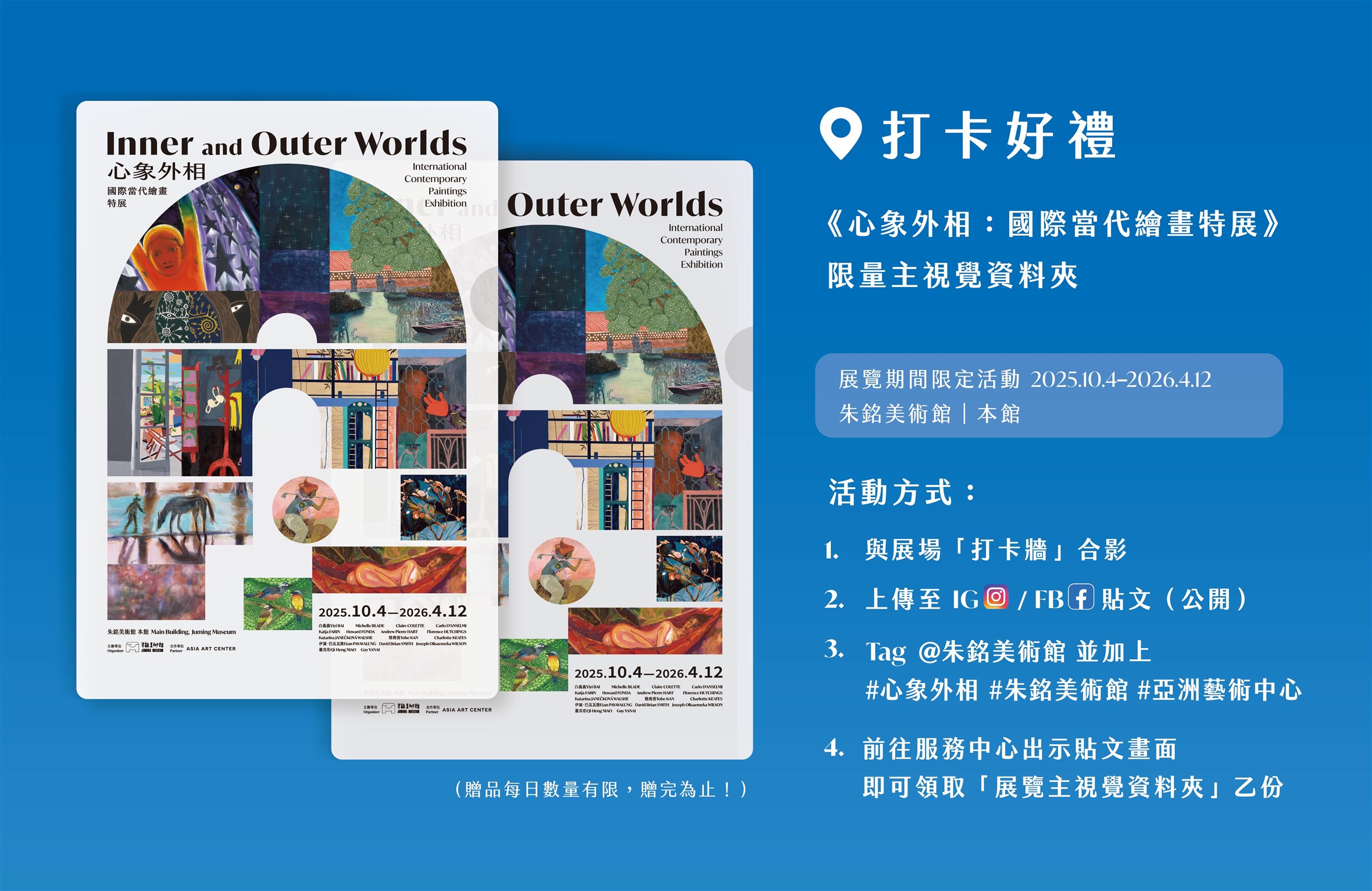 朱銘美術館與亞洲藝術中心聯手推出《心象外相:國際當代繪畫特展》,集結 16 位來自不同文化背景的藝術家,以多元視角描繪感知、社會、記憶與夢境。 展覽自開展以來廣受觀眾好評,現宣布展期延長至2026年4月26日,讓更多觀眾有機會走進當代繪畫的感知世界。同步推出工作坊體驗活動與展覽手冊,從「走入展間觀看」、到「親手創作體驗」、再到「將策展脈絡帶回收藏」,構築一場完整的藝術旅程,讓當代繪畫不只停留於牆面,而真正把藝術融入生活裡。朱銘美術館為回應觀眾的踴躍支持,推出展期限定「打卡送好禮」活動,於展場中與指定打卡牆拍照並完成上傳任務,即可至朱銘美術館服務中心出示貼文畫面兌換「展覽主視覺資料夾」乙份,每日贈品數量有限,贈完為止。邀請大家以影像記錄觀展時刻,帶走專屬展覽收藏品。