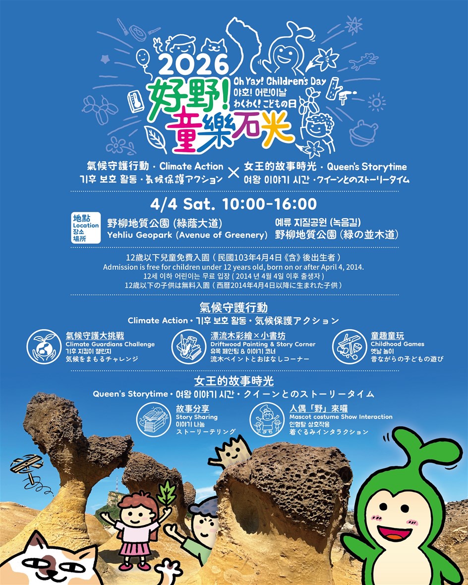 「2026好野!童樂石光」兒童節活動將於上午10點至下午4點舉行。活動當日12歲(含)以下兒童可享免費入園優惠(民國103年4月4日〈含〉後出生者)。誠摯邀請家長與孩子們在這個屬於兒童的節日裡,一同走進野柳,透過遊戲認識氣候變遷議題,在歡笑與探索中種下守護地球的種子,為未來寫下更永續的篇章。