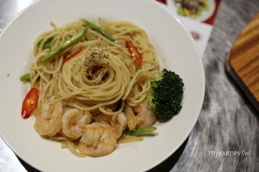 餐點方面,義大利麵價格在天母商圈屬相當親民。菜單分為清炒系與濃醬系,口味選擇多元,另不定期推出季節限定餐點。清炒系主打清爽風味,如醬油雞丁義大利麵、蘆筍蝦仁義大利麵,調味不重,保留食材原味;濃醬系則有番茄肉醬、鮭魚白醬等選擇,醬香濃郁但不膩口,適合喜愛厚實口感的消費者。